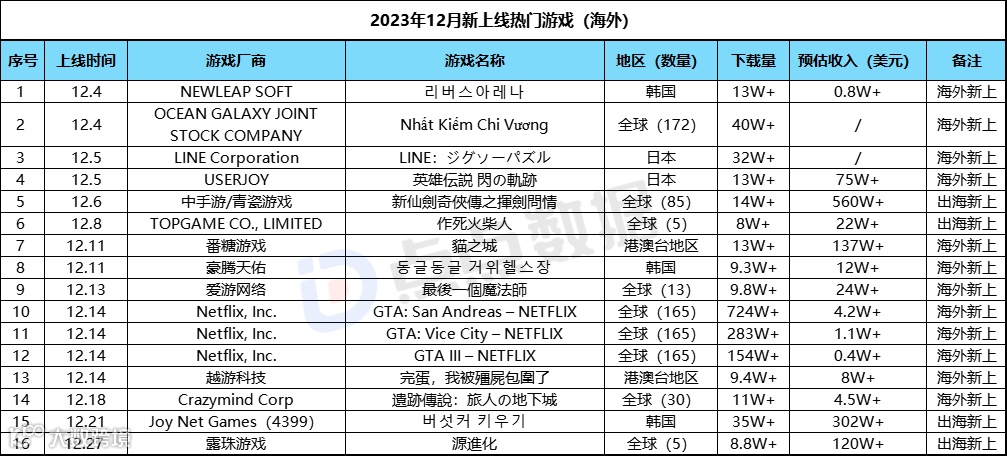 相对于国内市场的年末冲刺,年底海外手游新品市场则显得有些萧条,大厂近乎消声觅迹。与之相对应的是Netflix在推进进军移动游戏领域所抛出的又一系列大作——“GTA三部曲”(《GTA III》、《GTA: Vice City》、《GTA: San Andreas》)。R星三款游戏圈鼎鼎大名的开放世界第三人称游戏Netflix手游版本的上线令前者在游戏圈的知名度和影响力再度提升。