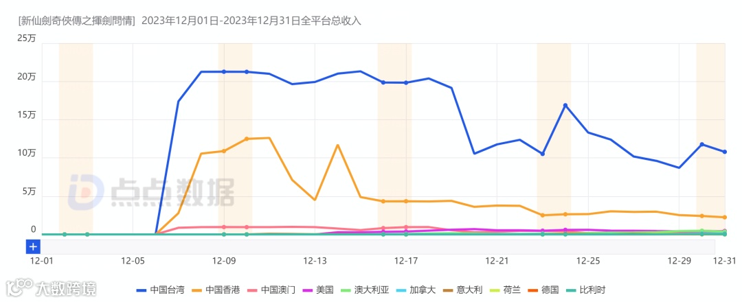 回归收入数据,12月海外市场看点并不多。由中手游与青瓷游戏联合开发,阿尔特游戏股份有限公司代理的《仙剑奇侠传》系列正版授权,创新社交卡牌 RPG 手机游戏新作《新仙剑奇侠传之挥剑问情》月初走向海外,并在以港澳台为代表的繁中区取得了不俗的成绩。其中中国台湾地区贡献了超过400万美元、超7成的月流水,仙剑IP在中国台湾地区的影响力可见一斑。
