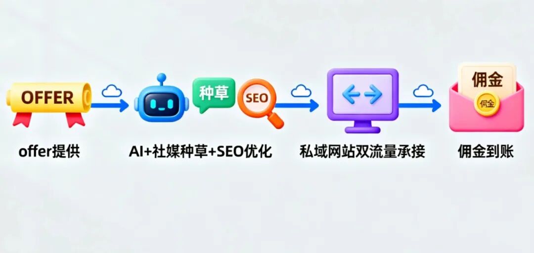 3. 变现闭环:私域网站嵌入offer推广链接,用户转化后联盟结算佣金,实现被动收入。