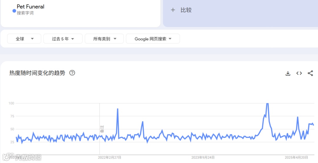 #petmemorial、#petgrief等话题在TikTok分别累计5.38万条、10.02万条内容,用户高频分享养宠故事与哀思表达。谷歌趋势显示,“Pet Funeral”全球搜索热度长期处于25—100高位,2022年4月、2024年10月及2025年4月至今出现三波明显峰值[3]。