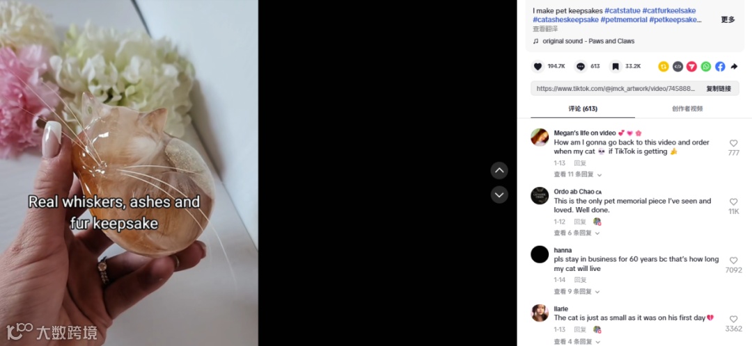 从刻有宠物爪印的琉璃骨灰罐,到可盛放毛发或骨灰的珠宝首饰,纪念形式日趋多元。TikTok博主@jmck_artwork推出的猫咪彩瓷玻璃纪念摆件(内置毛发、底部嵌照片与姓名),播放量超170万次,点赞达19万次,凸显定制化情感产品的强共鸣力[2]。