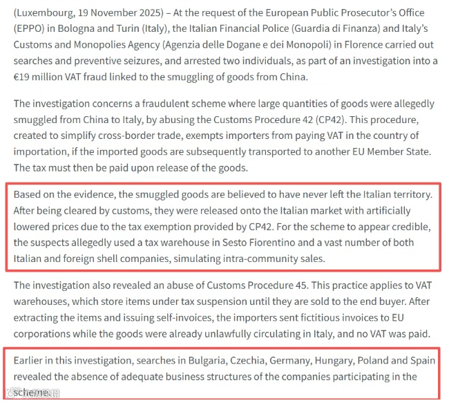 据欧洲独立检察官办公室披露,这两起具有代表性的VAT逃税案,揭示了跨境行业内长期潜伏的一条灰色违法链条。而在这条链条中,“CP42”这项海关程序被频繁滥用,成了关键环节。