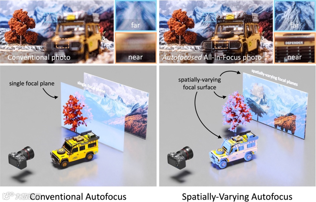 这项技术首次摆脱“单一焦平面”的束缚,将对焦从固定平面升级为可自由编程、随场景动态调整的焦曲面,使相机能够在复杂三维场景中一次性捕获全区域清晰图像。