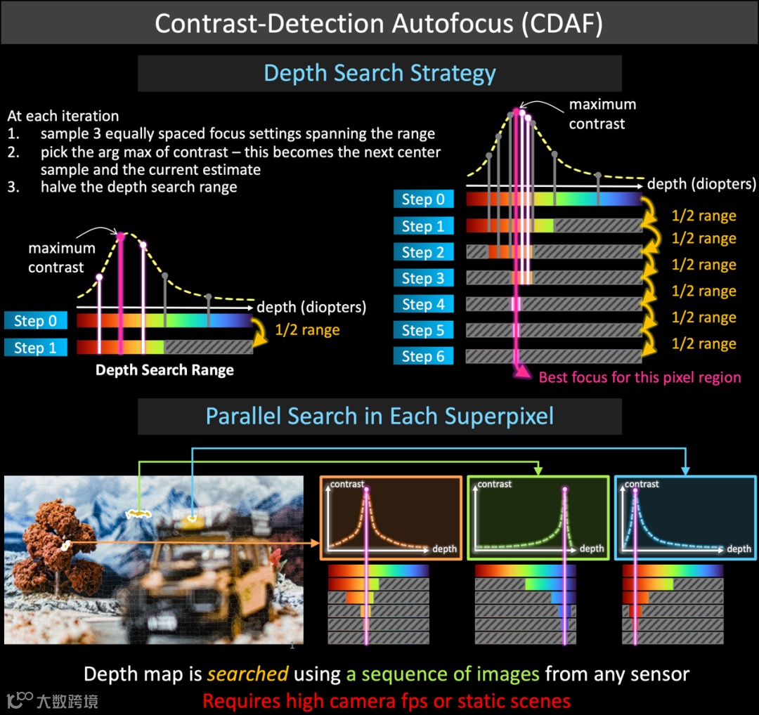 仅具可变焦硬件仍不足,还需精准感知深度以分配对焦策略。对比度探测法(CDAF)