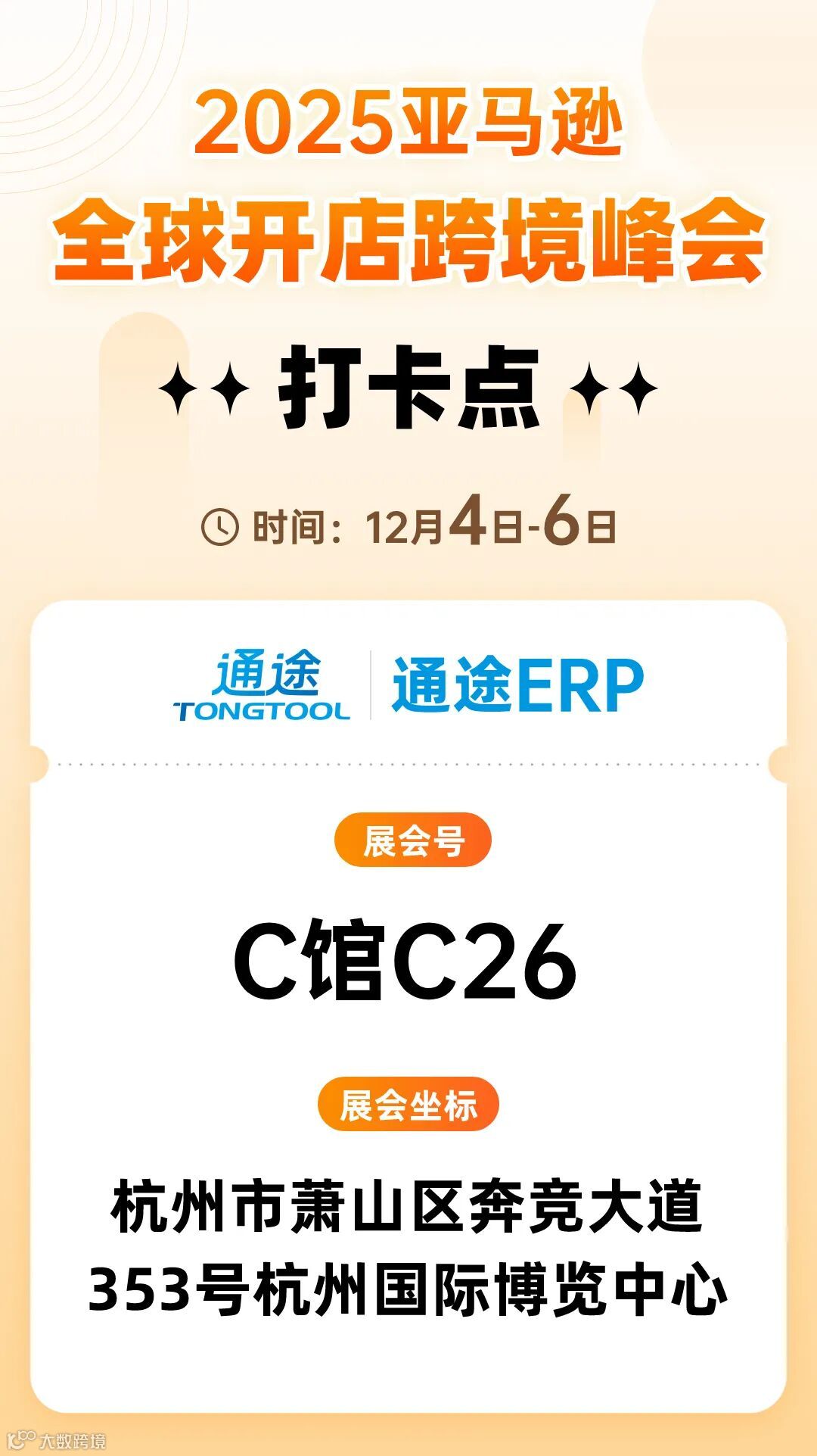 2025亚马逊全球开店跨境峰会将于12月4日至6日在杭州举行,通途ERP诚邀广大跨境卖家莅临展位C26,共赴行业盛会。