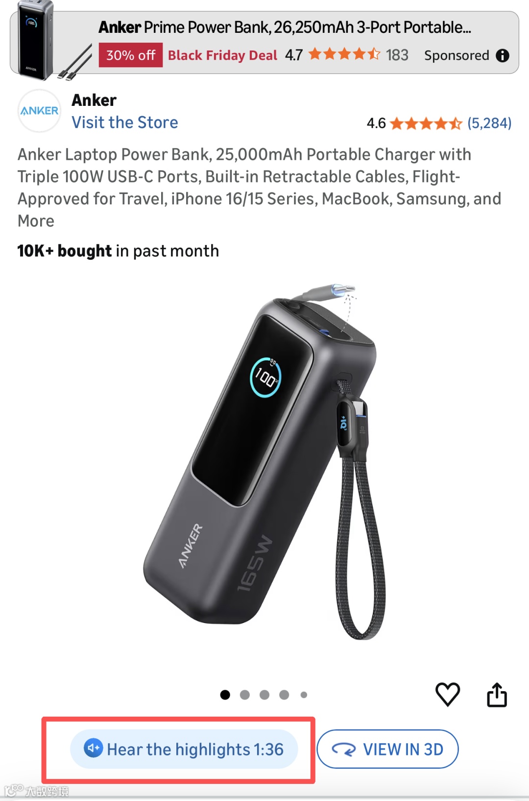近期,亚马逊美国站上线测试新功能“Hear the Highlights”,利用AI技术自动提取产品Listing中的关键信息,生成1-2分钟的问答式语音讲解,帮助买家快速了解产品核心内容。