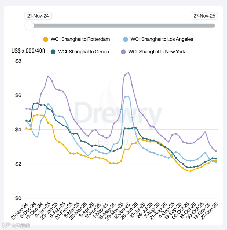 但市场反应相反:12月1日实际交易中,达飞、赫伯罗特等公司部分航次报价不升反降。上海出口集装箱运价指数(SCFI)显示,美西航线近三周累计下跌37.85%,美东跌30.65%,欧洲基本港微降3.5%[4]。
