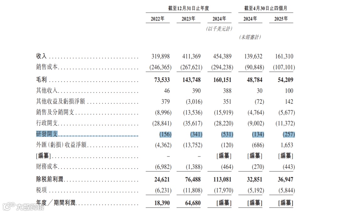 然而,高歌猛进的背后也暗藏隐忧[3]。招股书显示,乐舒适的业绩增速已明显放缓,2024 年营收增速从前一年的 28.6% 降至 10.5%[3]。净利润增速从 251.7% 降至 47%[3]。更令人警惕的是,公司在研发上的投入极其微薄[3]。以 2024 年为例,公司 32 亿元人民币的营收,对应的研发开支不足 53.1 万美元,研发团队仅有 4 人,研发费用占营收比重低于0.12%[3]。