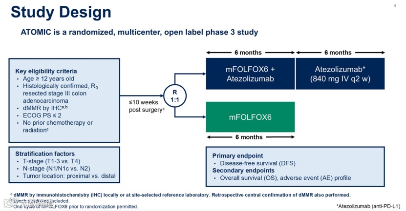 ATOMIC研究是一项随机对照、多中心的III期临床试验,旨在评估在标准mFOLFOX6辅助化疗的基础上,联合抗阿替利珠单抗(PD-L1单抗),是否可以进一步改善III期dMMR结肠癌患者的预后。