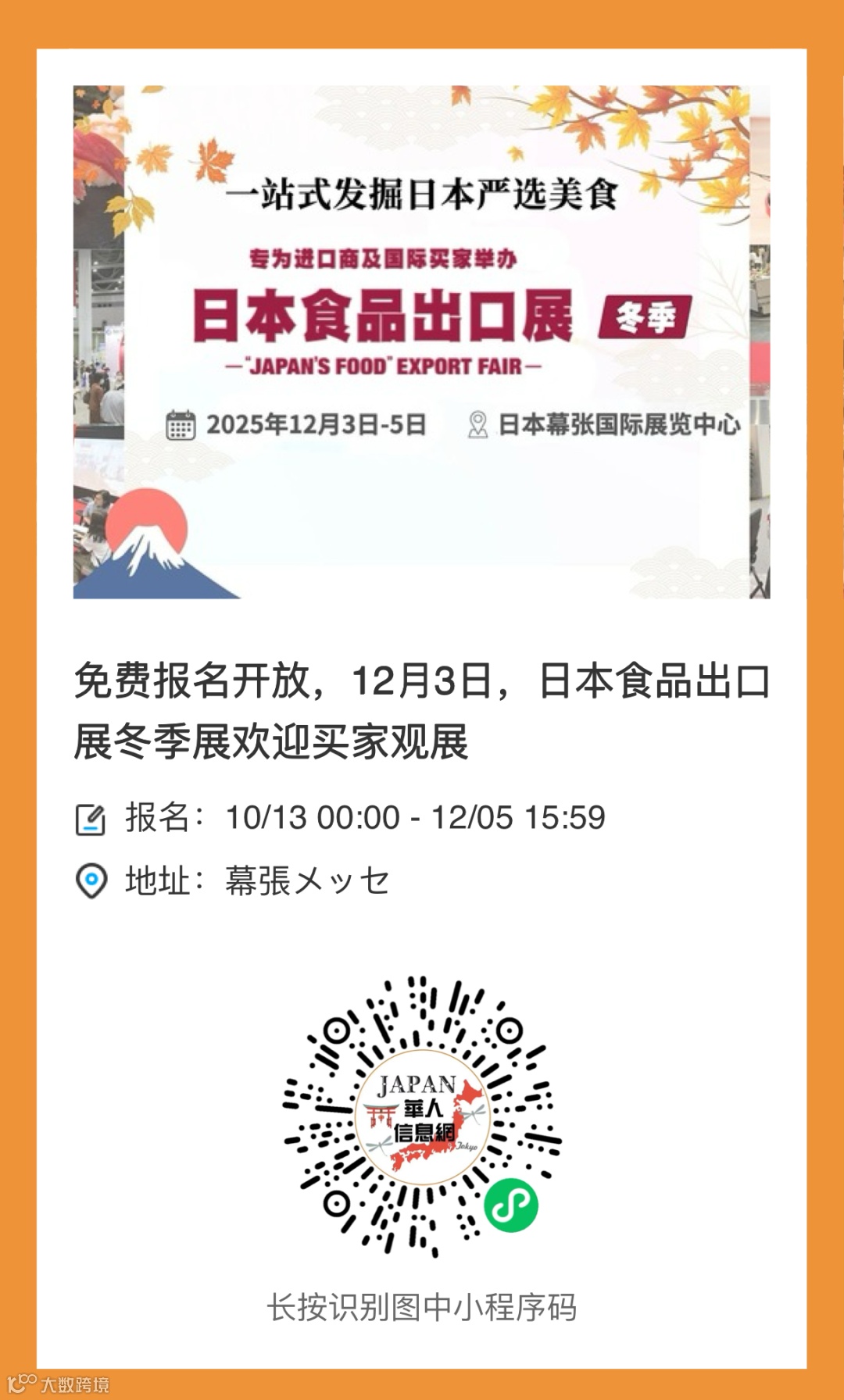 第11届日本食品出口展将于2025年12月3—5日在日本千叶县幕张国际展览中心举行,欢迎提前完成观众登记,获取免费入场资格。