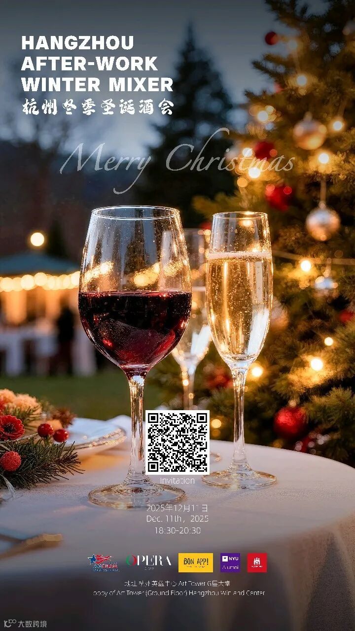 杭州的冬季酒会再度回归——一夜限定的暖光与轻松对话。12月11日,AmCham、Bon App与NYU Alumni将于英蓝中心Art Tower大厅举办一场冬日晚间社交,灯光、美食与年末的松弛感将在此汇聚。