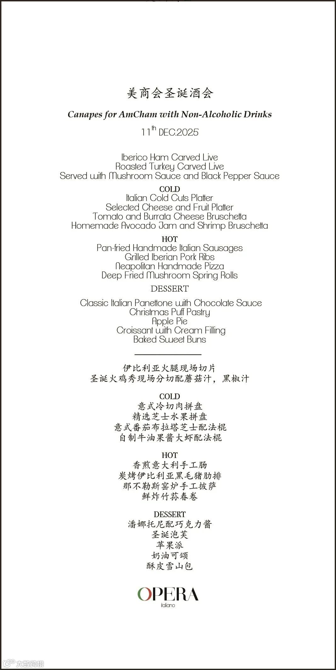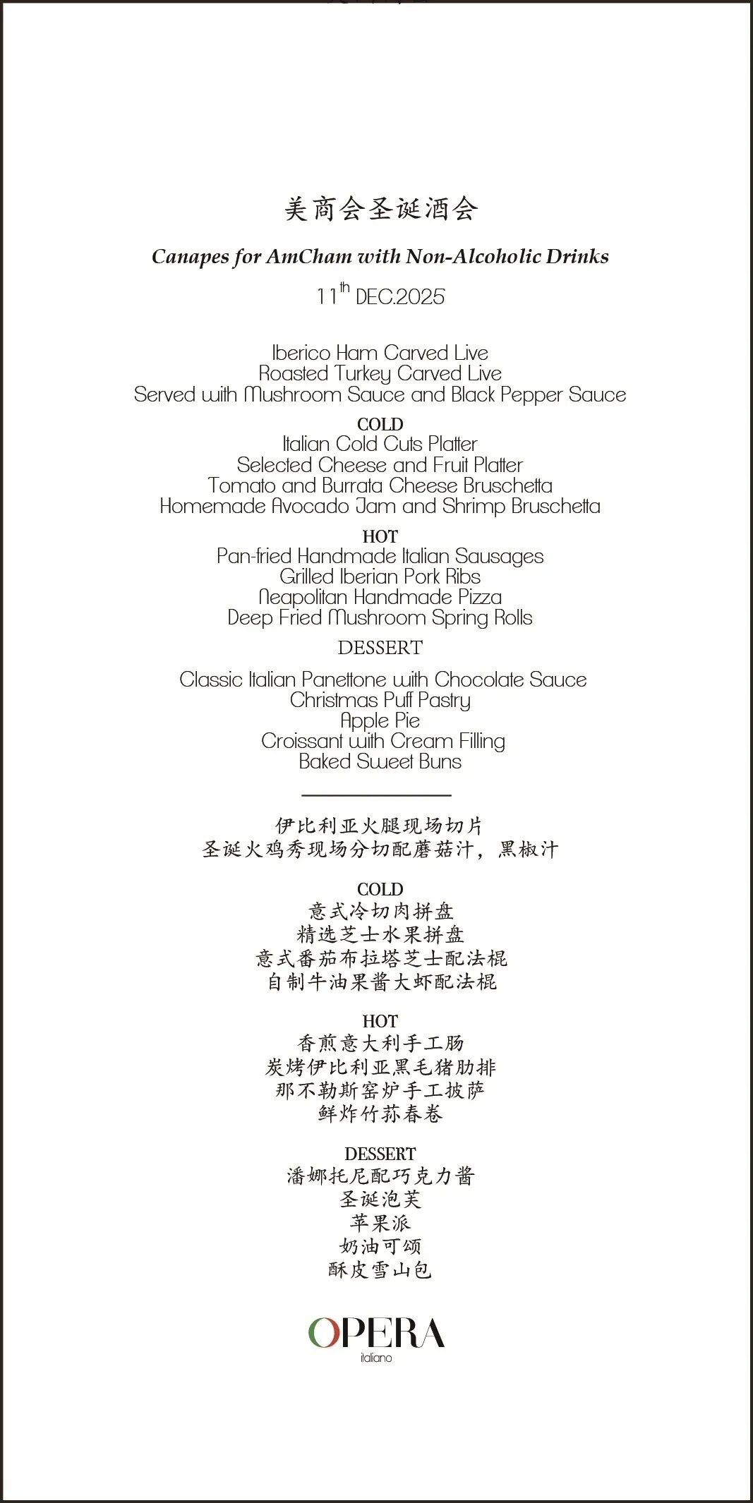 OPERA Italian 准备了冬季精选:帕尔玛火腿、节日火鸡、意式香肠与拿坡里披萨,热气从餐台升起,与冰凉酒杯形成对比。甜点是轻盈泡芙与巧克力潘娜托尼,适合边聊边取,一口节日、一口暖心。