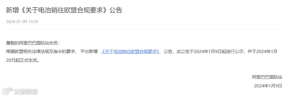 近日阿里巴巴国际站发布新增《关于电池销往欧盟合规要求》公告,公告如下: