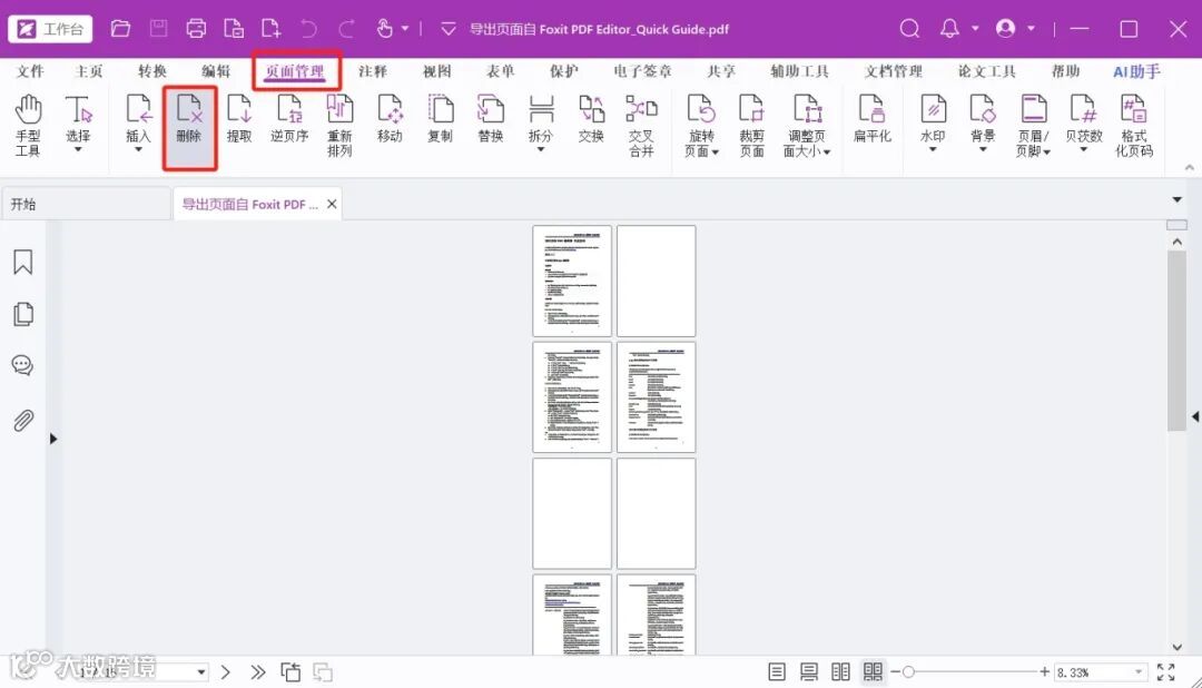 我们利用福昕高级PDF编辑器,打开一份有空白页的PDF文档,点击“页面管理”→“删除”。