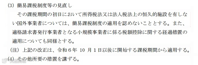 具体而言,日本内阁理事会会议通过了《令和6年度税制更正大纲》,该大纲涵盖了个人所得税、资产税、企业税务、国际税收以及消费税等多个方面的政策改革。重要的变化针对于对于在其征税期间的第一天没有在日本拥有所得税法或法人税法意义上的永久性设施(例如在日本的办公室)的国外事业者,不再允许应用简易征税制度。此外,也不再适用于成为适格请求书发行者的小规模事业者相关的税额扣除的过渡措施。