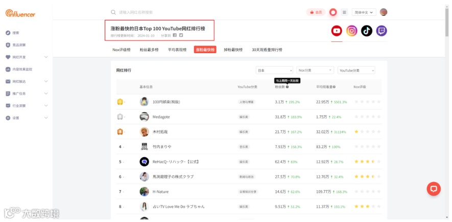 Nox聚星涨粉榜单提供7天内粉丝数涨幅最快网红排名,支持国家地区、Nox分类、平台分类等多种筛选项,帮助用户实时锁定优质网红。