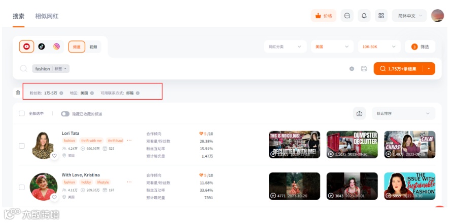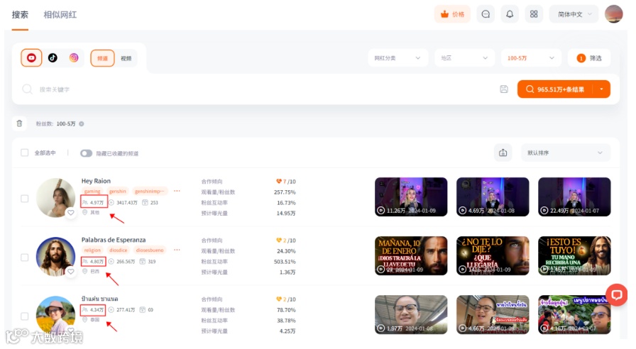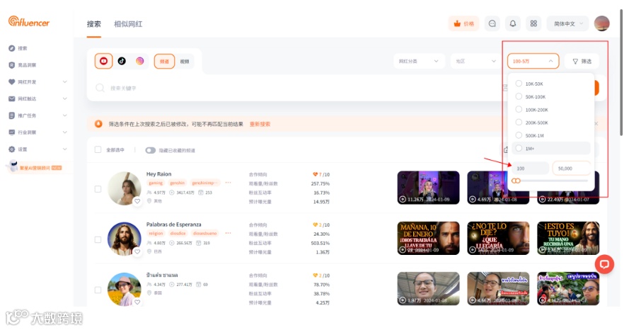 通过粉丝数筛选项,自定义目标网红粉丝量范围,即可快速筛选符合相应条件的网红。比如筛选YouTube平台粉丝数在10k-50k网红,简单一键即可快速获取所需网红!