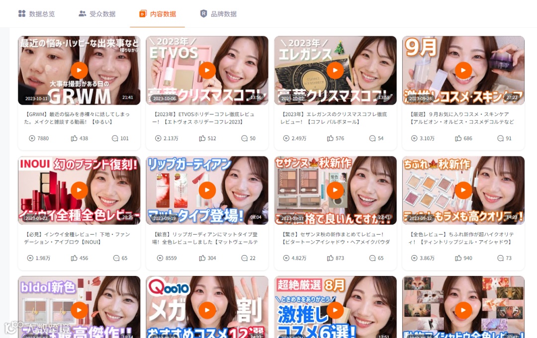 通过Nox聚星网红详情页内容数据分析可以观察到该频道最新30个投稿或最近90天投稿的内容数据趋势,帮助用户通过播放量、点赞数、评论数、互动率等等数据综合分析频道表现情况。