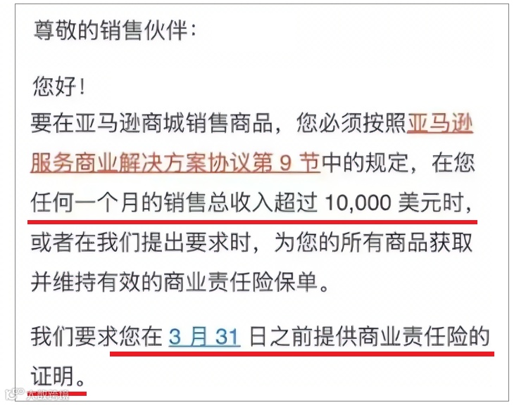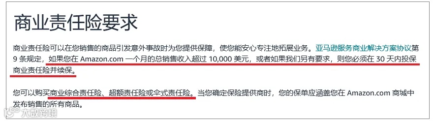 据了解,卖家必须按照亚马逊服务商业解决方案协议第9节中的规定,在店铺任何一个月的销售总收入超过1万美元时,或者在亚马逊提出要求时,为您的所有商品获取并维持有效的商业责任险保单。