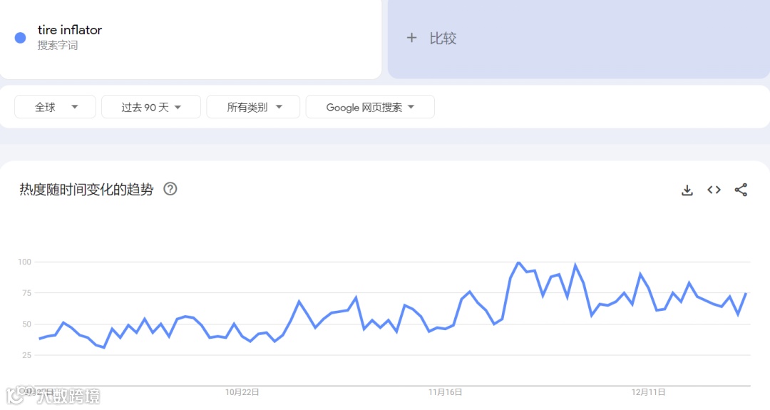 根据谷歌趋势数据显示,“tire inflator”(轮胎充气机)一词近90天内搜索热度持续在30—100之间,基本维持在50—75之间。