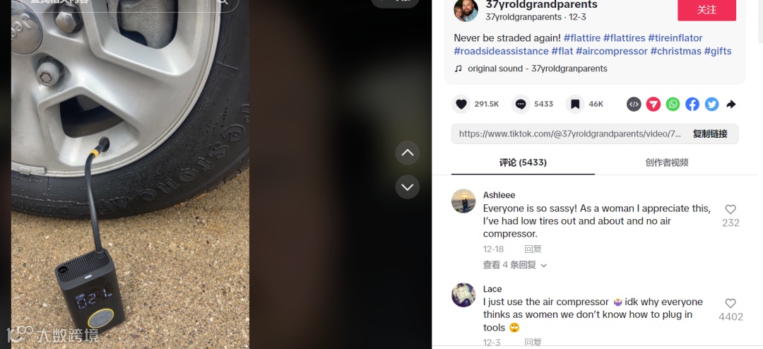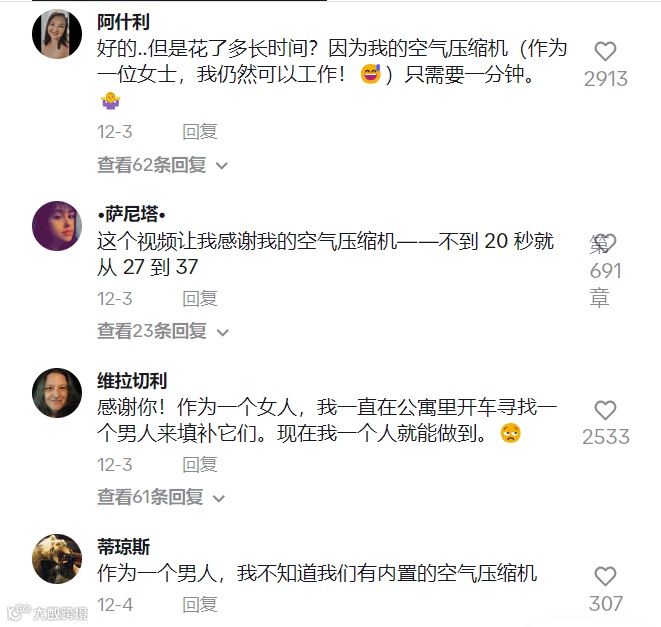 该视频中这款便携式轮胎充气机吸引了许多用户关注,并且纷纷在评论区留言,感叹这款充气机的便捷,并询问购买途径和方法。