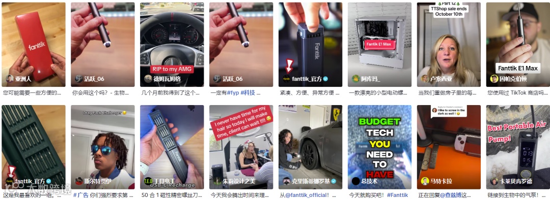 Shoptop搜索发现,Fanttik与TikTok上多名户外运动爱好者、汽配爱好者合作,通过博主分享使用Fanttik产品以及多种情景下测评视频。