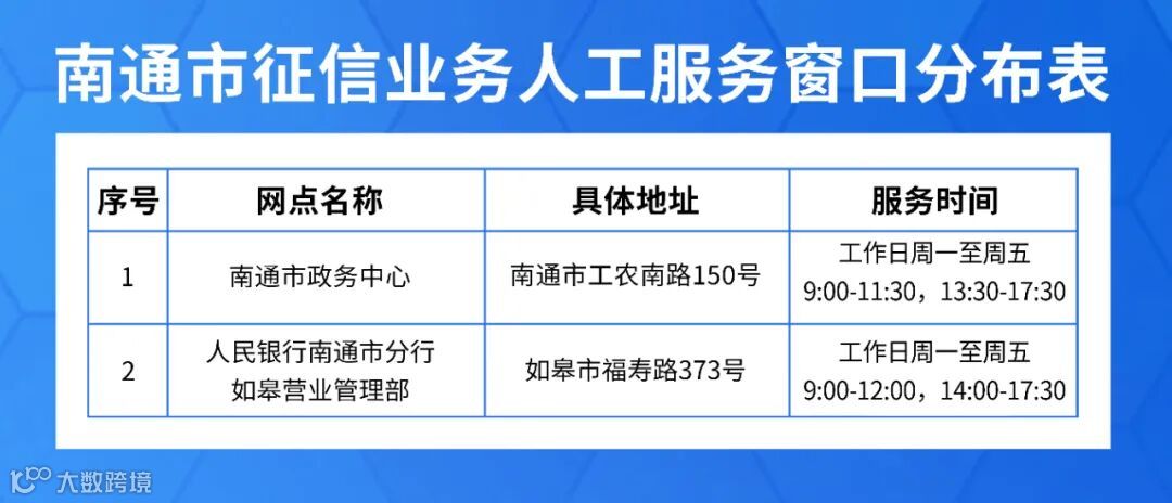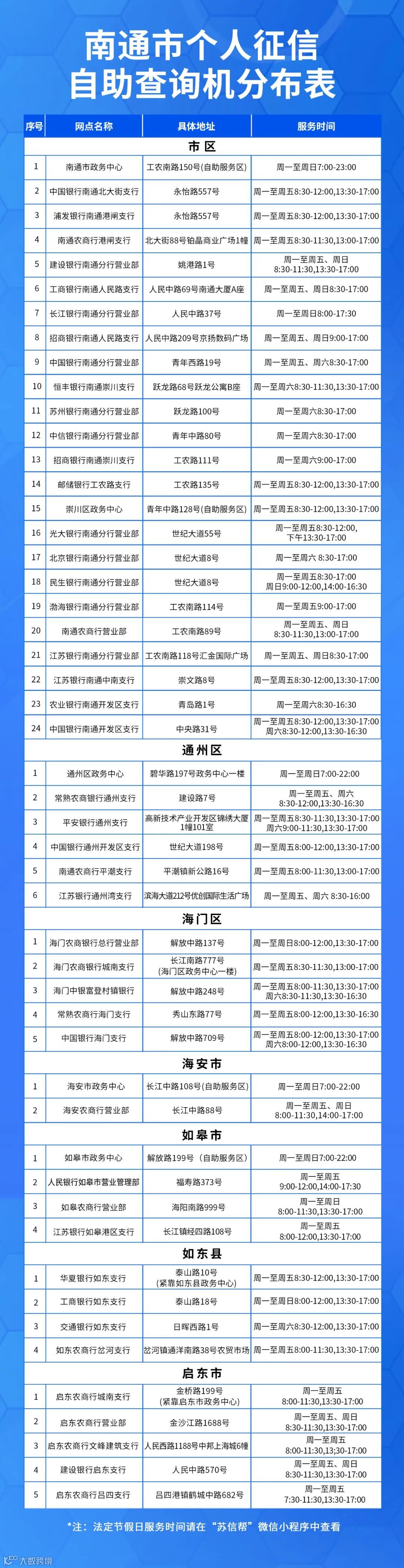 目前,南通市民可携带本人有效身份证原件在各商业银行代理查询网点和人民银行征信服务窗口的自助查询机上查询。