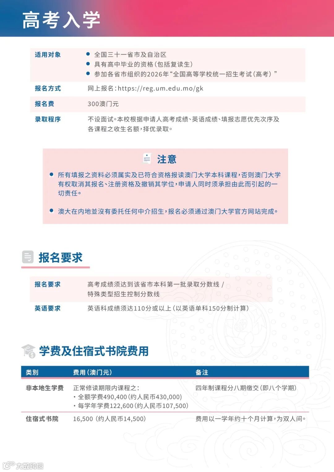 🌈报考澳门大学该如何申请?高考多少分能申请?如何参与加分政策?有奖学金吗?为帮助各位考生家长顺利报考澳门大学,名校综合评价团队特制作《2026香港澳门院校报考指南》PDF版电子资料,内含港澳高校申请流程及时间安排、招生分数线及成绩要求、21所港澳高校政策介绍等内容!