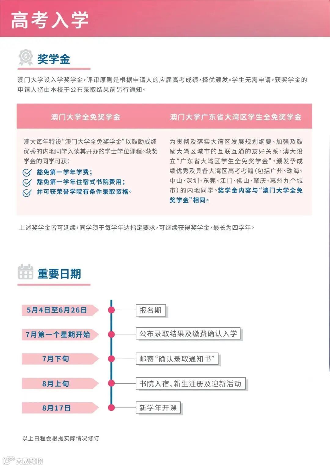 10月13日,澳门大学2026年内地高考生招生简章发布!报名时间为2026年5月4日至6月26日,符合条件者最高可加20分。名校综合评价团队整理了完整版简章信息及热门问答,目标澳门大学考生家长重点关注!