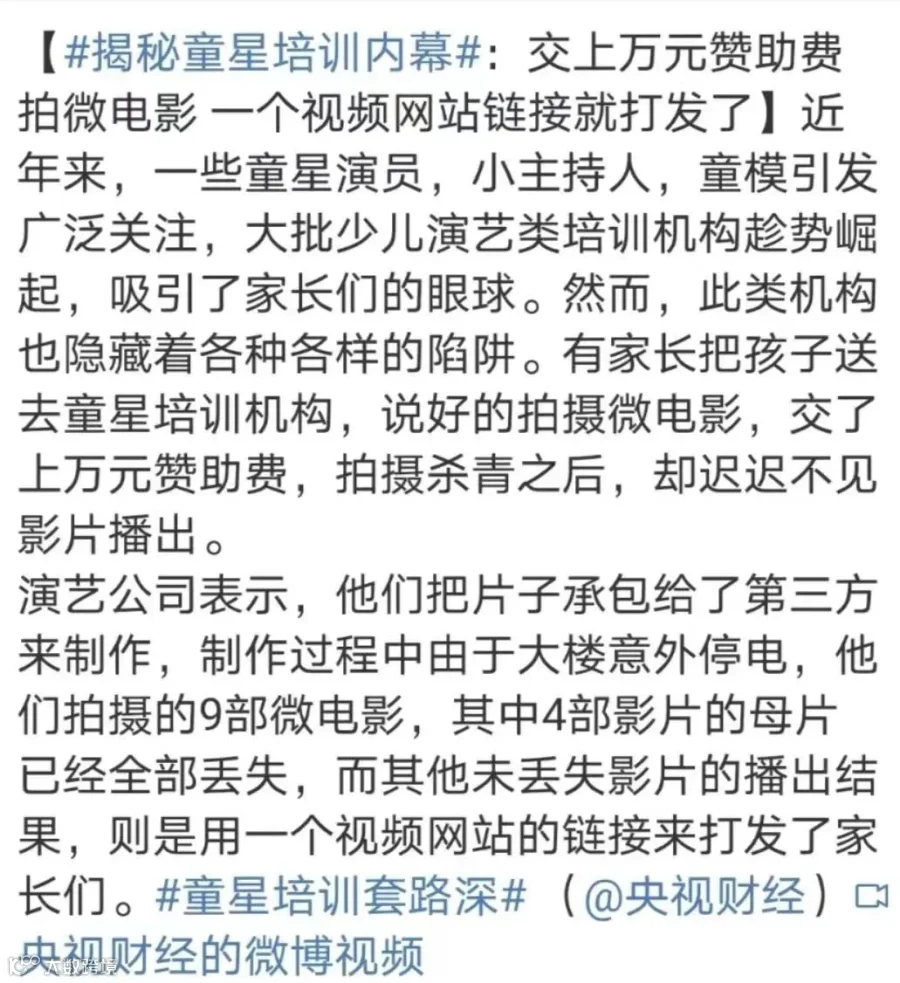 家长将童星视为阶级跃升的捷径,相比需长期投入且不确定性高的练习生模式,横店“童漂”看似成本更低、成名路径更短[k]。然而,追梦背后暗藏层层套路。为快速获取演出机会,家长被诱导加入儿童经纪公司的“会员制”服务:2万元一年保3个戏,5万元三年保8个,8万元五年保12个[k]。此类承诺多为口头约定,实际兑现率极低,骗局频发,有家长支付定金后遭拉黑,或花数万元换来仅作背景板、最终未入正片的角色[k]。