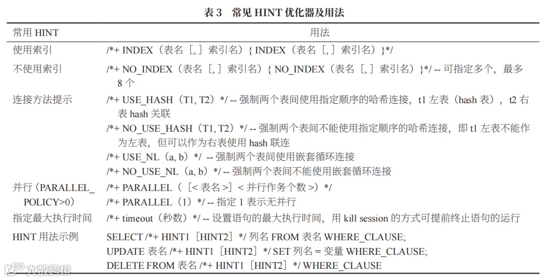 相同的SQL语句在不同数据库产品上的性能表现可能会不同。在进行业务软件测试的同时,使用国产数据库的性能监控视图和SQL日志找出运行较慢的SQL和高频SQL,针对性地进行SQL语句性能调优。在适配改造中最常用的优化方式是使用HINT优化器。某型国产数据库使用HINT优化器提示器,通过在SQL语句中标注特定信息,影响数据库后台优化器行为。常见优化器及用法见表3