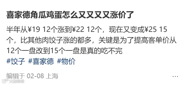 更让消费者不满的是“减量不减价”策略:部分城市曾将15只减为12只,随后恢复数量却继续涨价。角瓜鸡蛋饺从19元涨至25元,标榜“加量不加价”,实则双重抬价[k]。