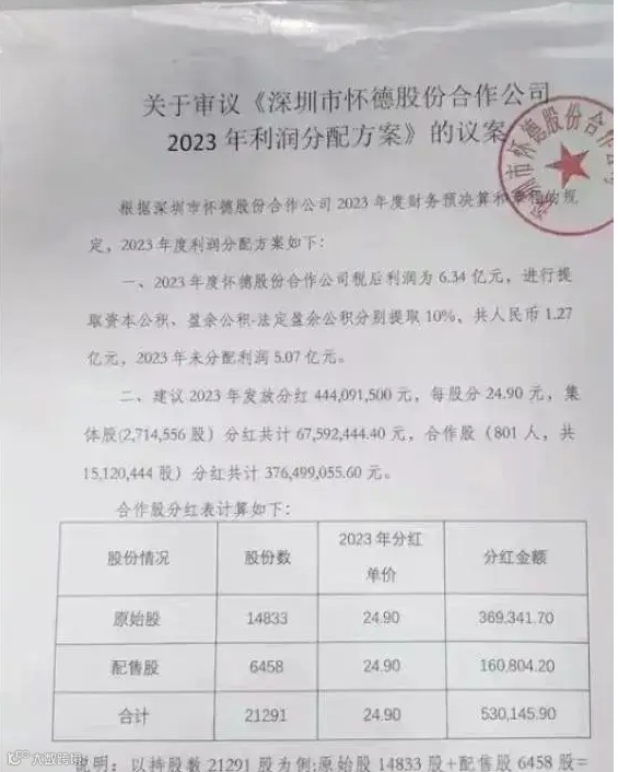 一份流传于网络的2023年分红方案显示,怀德村税后利润达6.34亿元,发放分红约4.44亿元,其中801名合作股股东人均分红达47万元[k]。