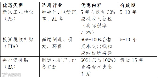 马来西亚为吸引外资,推出“新投资激励基金”(NIIF),覆盖新兴工业地位(PS)、投资税收补贴(ITA)等(见表4):