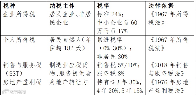 马来西亚税种结构简洁,核心税种包括企业所得税、个人所得税、销售与服务税(SST)等(见表1):
