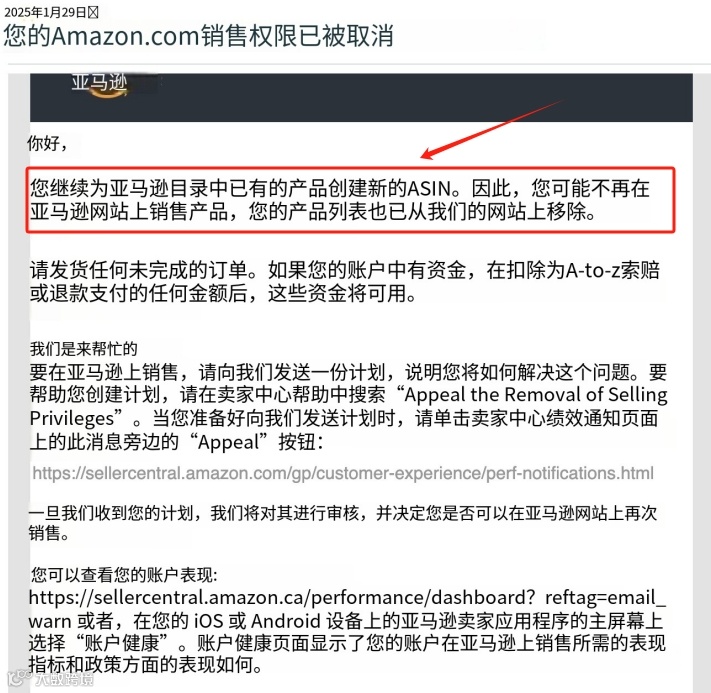 一位卖家在2025年2月17日突然收到亚马逊的绩效通知,称其存在重复创建 ASIN 和变体合并滥用的行为,随后店铺于2月20日被正式封禁。