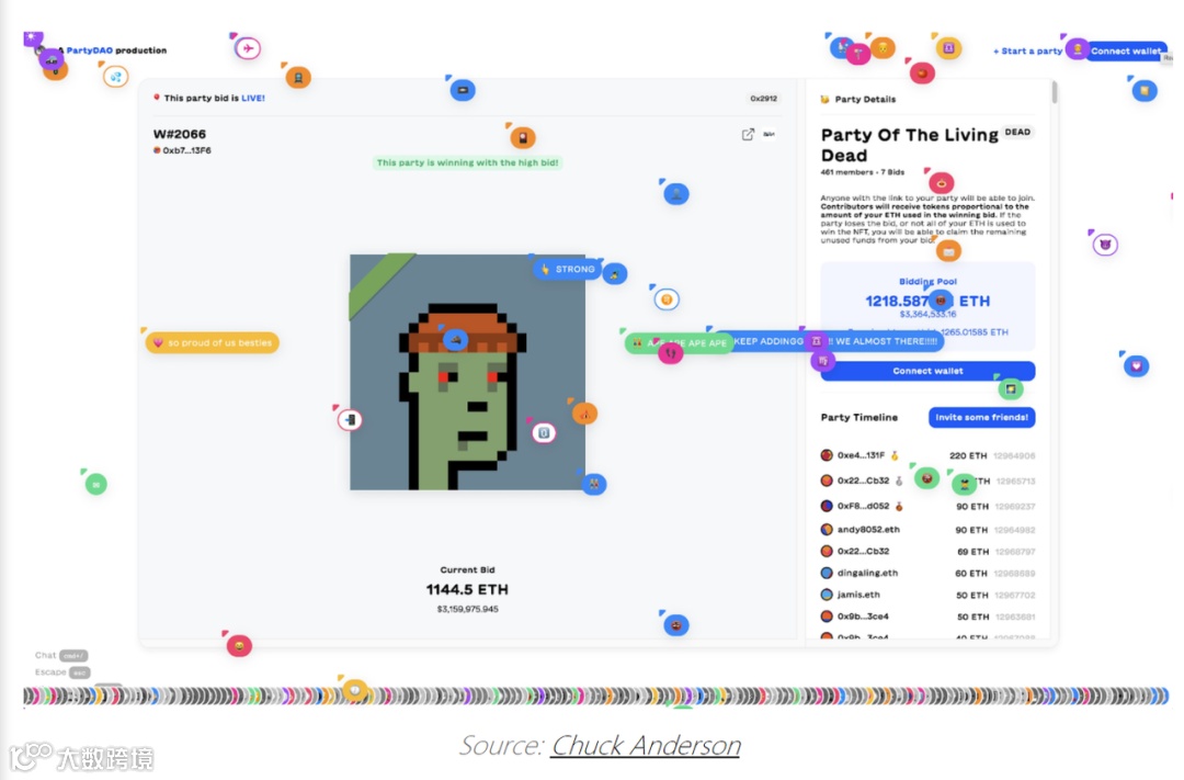 PartyBid 平台曾组织 478 人联合竞拍,以 1201.725 ETH(约 375 万美元)购得一个 Punk,参与者集体更换头像,体现 NFT 的社交属性与社区凝聚力[k]。