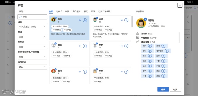 3.在声音一栏中可以选择不同语言、性别、年龄段的AI声音,并且可以选择AI声音的说话风格