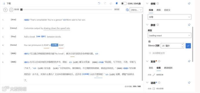 2.在页面左边输入想要阅读的文案,右边栏功能分别为声音、停顿、静音、发音、语调、语速、音高、音量,可以分别调整
