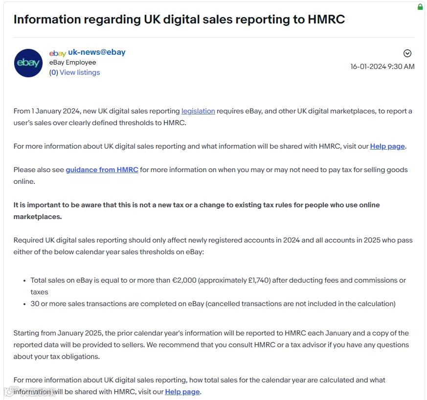从2024年1月1日起,新的英国数字销售报告法规要求eBay和其他英国数字市场向英国税务总署报告用户的销售额,只有当销售额达到明确定义的阈值时才需要报告。
