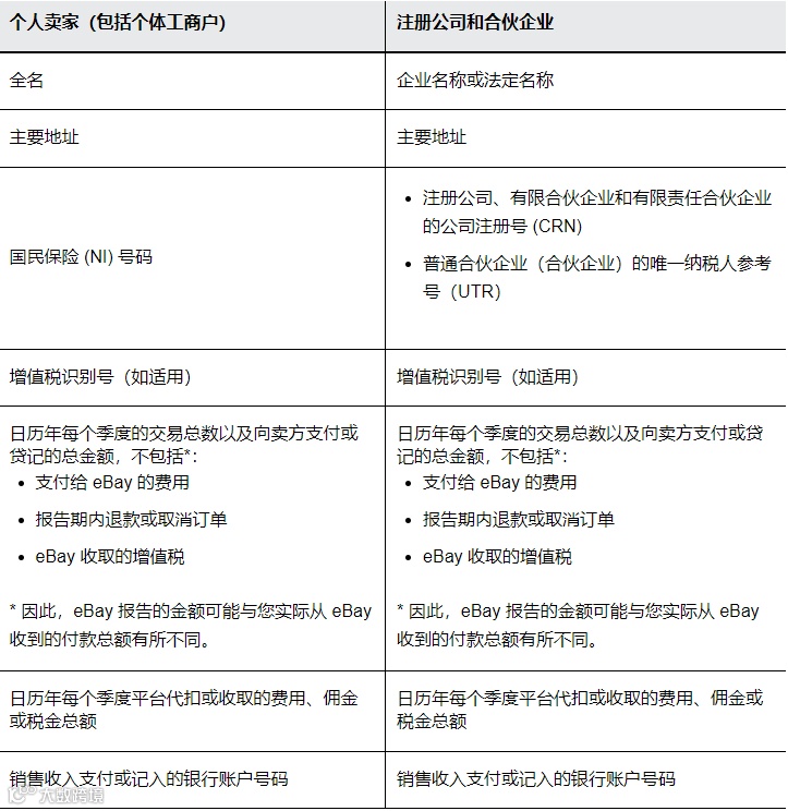 从2025年1月开始,eBay将开始每年向英国税务总署报告。每年1月,我们将报告上一年的数据,并提供报告数据的副本供您审查。如果您符合上述任一门槛,将向英国税务总署共享以下信息: