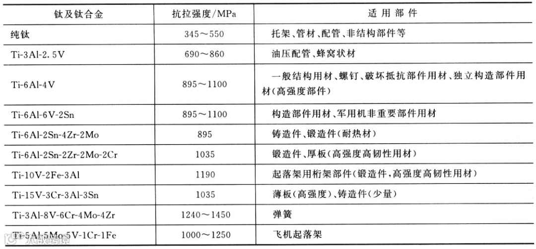 钛合金不仅具有高的比强度,而且还具有使用温度范围宽、耐腐蚀性能好、与聚合物基复合材料电化学相容等优势,可以有效地降低飞行器的重量。在飞行器机身和发动机部件中,钛都是不可缺少的原材料 ,飞机的用钛量约占全球金属钛产量的一半。