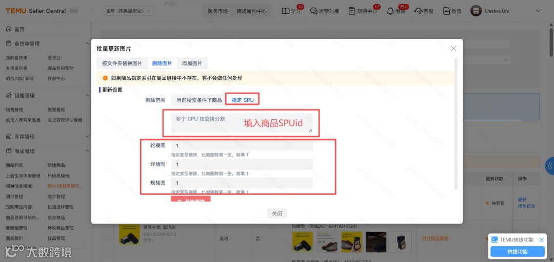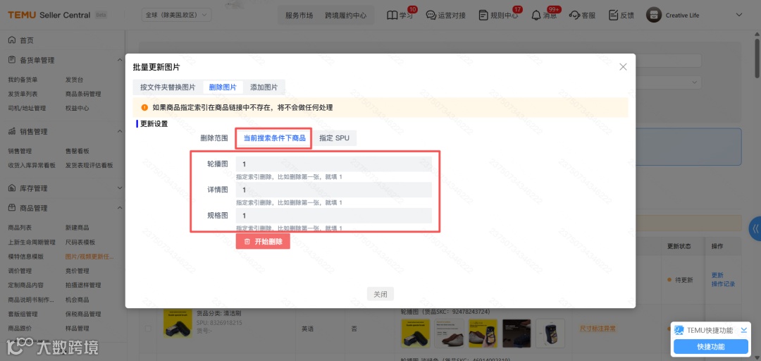 可按当前搜索条件下商品进行删除,也可指定SPU删除