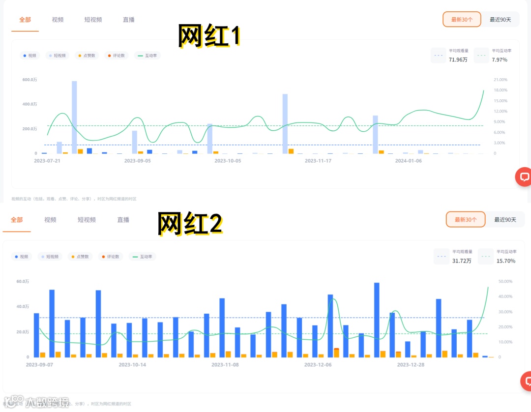 从上图数据显示,网红1不仅在粉丝数上略高于网红2,并且在平均观看量以及观看量/粉丝数等多个数值上都高于网红2的表现,且30天内的粉丝增长率以及互动率都呈现较好的增长态势。