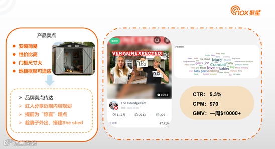 与此同时结合Nox聚星平台往网红数据分析功能,查看其近期高曝光、高互动视频,进行视频分析和创意总结,配合Nox聚星AI营销顾问基于大数据给出的营销建议,最终确定以“伴侣一起露营短剧形式+为每一平凡的日子送上惊喜的礼物场景”为创意主题。在此主题下通过准备过程对产品卖点进行深入诠释,并融合了家人之间的温情瞬间,赋予产品情感承载的价值属性。