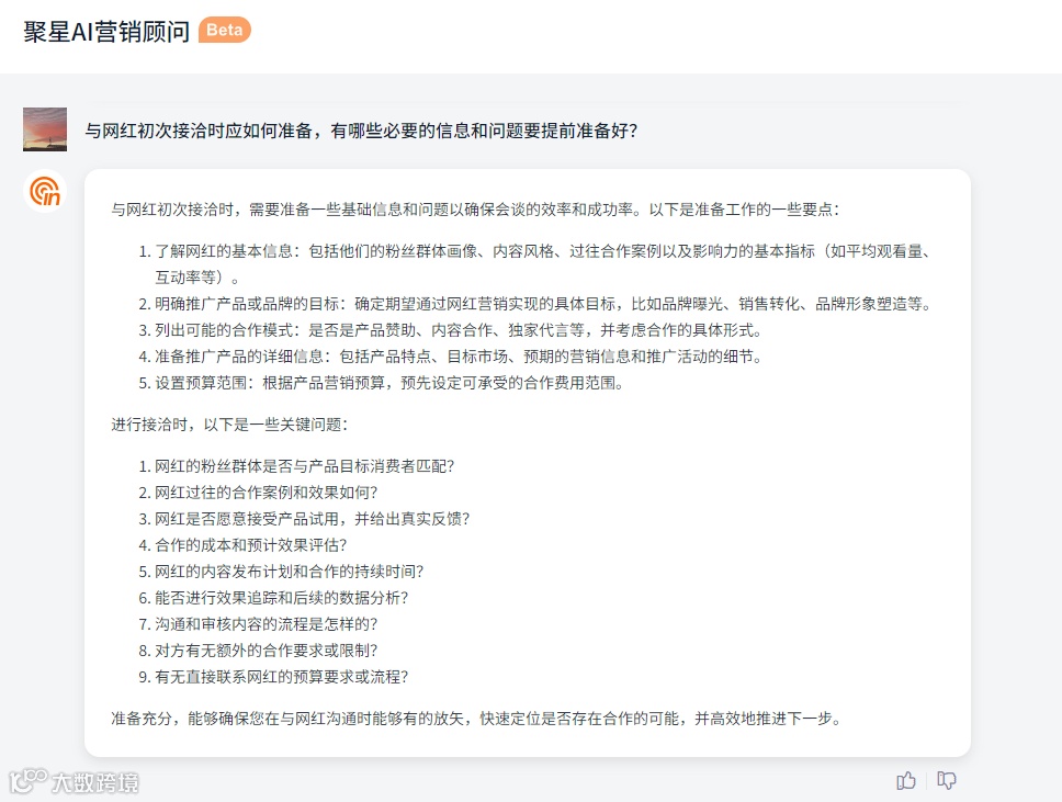 对于首次联系网红不知道应该准备哪些信息和问题时,在对话框中输入“与网红初次接洽时应该如何准备,有哪些必要信息和问题要提前准备好?”,Nox聚星AI营销顾问就会根据你的描述分析你的需求,从而进行理解和推理,呈现出以下结果: