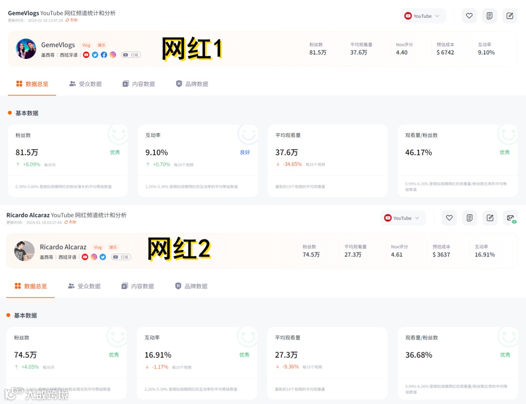 例如下图,同样是墨西哥地区的YouTube娱乐网红,在粉丝层级相差不大的基础上,通过Nox聚星平台可以快速获得频道互动率、平均观看量等频道数据,由此判断网红频道质量。