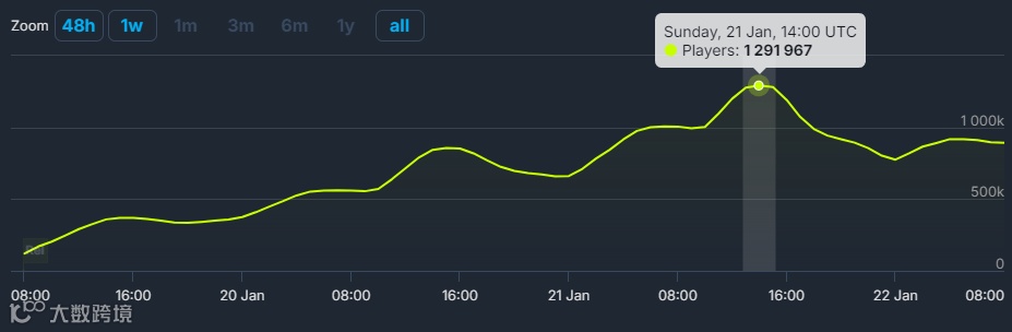 游戏在线人数一路从37万开始飙升,同时在线峰值人数接近130万,超越《赛博朋克2077》,进入历史前五,截至发稿其在线人数依然有89万。