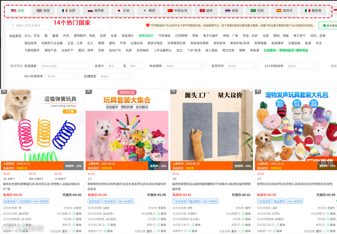 通过店雷达国家热门货盘,可以看到跨境用户在1688平台下单不同国家的品,挖掘下游市场的潜在需求,能间接反映市场热度和趋势,比如近期宠物用品中,玩具、猫抓板等较为畅销。