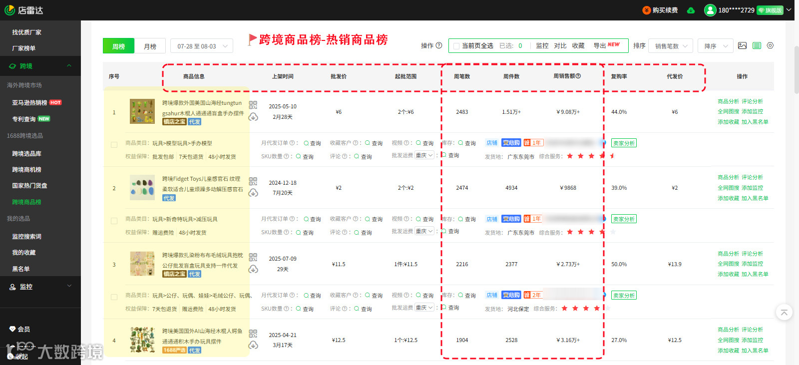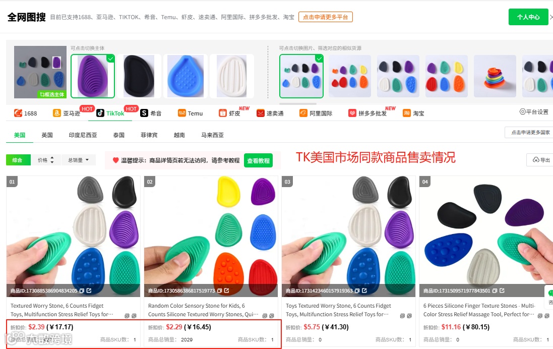 新手可通过店雷达跨境选品工具查看热销商品榜,这里会展示近期卖家采买较多的商品,能直接反映下游市场的需求的热卖程度,比如在玩具类目下发现一款儿童感官石正在热卖,且批发价只需人民币2元,用全网图搜搜索TK上的同款产品,可以看到同行定价2-10美元不等,利润空间大,且销量不错,说明该产品有市场。